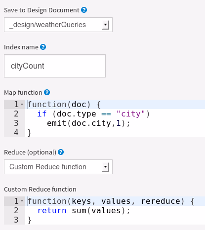 Storing new documents is simple and is shown in the full code listing. For the queries I am using the MapReduce feature of couchDB. In a “map” function I return the city name (and just the integer value 1), in the reduce function I am aggregating (summing up) the values by city. Both functions could be defined in the Python script and then passed into Cloudant as part of the query or predefined for more performance. I chose the latter one. So I created a so-called “secondary index” in my Cloudant database, it is called “view” in my couchDB. They are stored as part of a “design document” (shown is Cloudant):