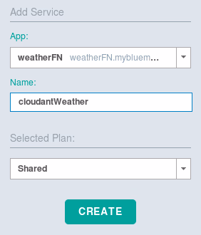 It will bring up a screen showing information about the service itself, on usage terms, and on the right side of it a dialog “Add Service” for adding the service to your account. Here you can already bind the new database service to your application by selecting an existing application from a dropdown list. I did that and gave my new Cloudant service the name “cloudantWeather” as shown: