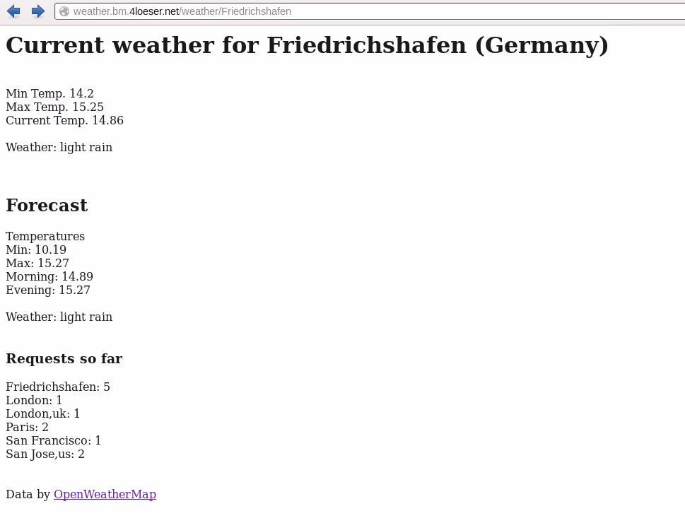Storing the weather data locally doesn’t make sense because I can query much more historical data on OpenWeatherMap. So I am going to use a database to log information about for which city and when the data was requested. That information, in aggregated form, could then be reported as fun fact to each user of the app. I chose Cloudant because it is simple to use, adequate for the intended purpose, has free usage plans on Bluemix, and I can use it and test locally as couchDB.