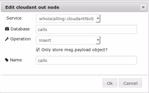 On the left we see “phone” node as http input. Connected to it is the “ok” node which sends an http response back, telling the phone company’s Web services that we received the information. The other connected node is a “json” processor which translates the payload (who called which number) into a meaningful JSON object. That object is then moved on to the “calls” node, a Cloudant output node. All we needed was to select the Cloudant service on Bluemix and to configure the database name.