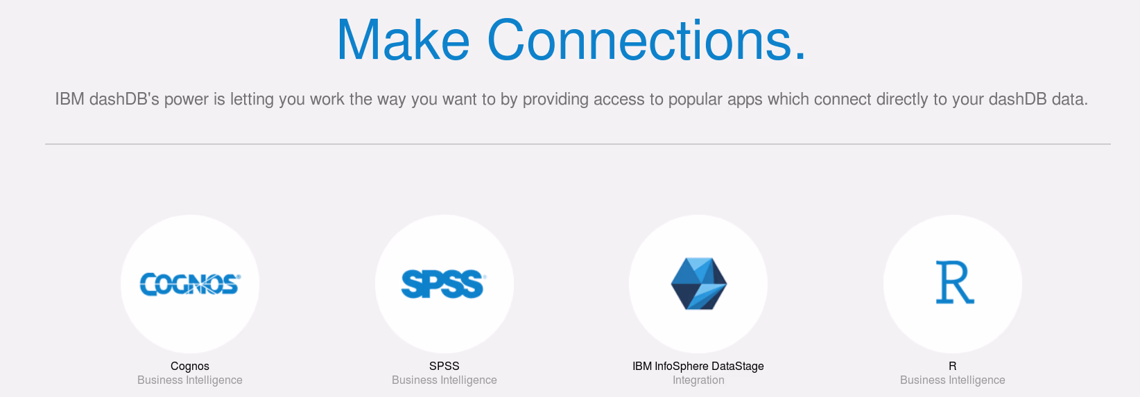 dashDB is a cloud-based analytics database (“analytics in a dash”)) with roots in Netezza and DB2 with BLU Acceleration. Data is stored in table (rows and columns) format. It is ready to connect all kinds analytic tools, local or cloud-based, and is already set up for geo-spatial data analysis (instructions on how to use the ESRI ArcGIS Desktop are provided). The best is that your regular SQL database/analytic tools continue to work, see below for details.