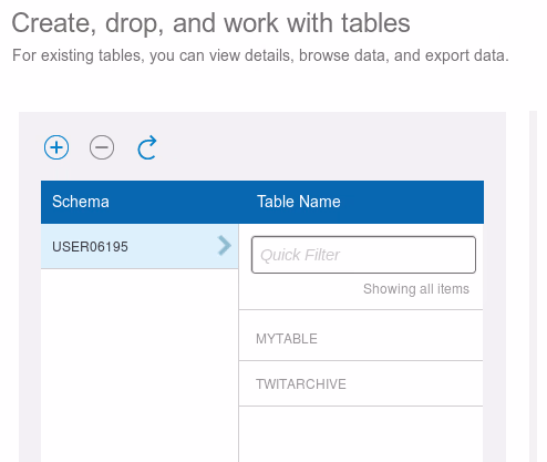 However, there is no option to change the table structure. Selecting the “+” in the “Create, drop, and work with tables” dialogue is to add a new table to the chosen schema, but is THE solution to modify/alter the structure of an existing table using the administration console. The reason is that it brings up a form to enter the SQL DDL statement to create a new table.
