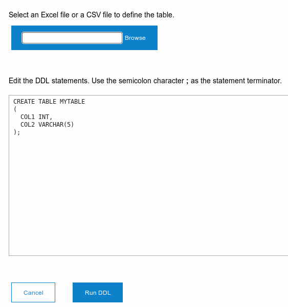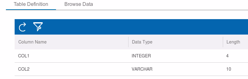 When you select an existing table like “MYTABLE”, the GUI will show the column and data type definition or the existing data: