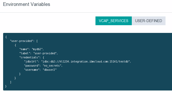 "jdbcUrl": "jdbc:db2://hl1234.integration.ibmcloud.com:15141/testdb","username": "dbuser2", "password": "no_secrets" }'