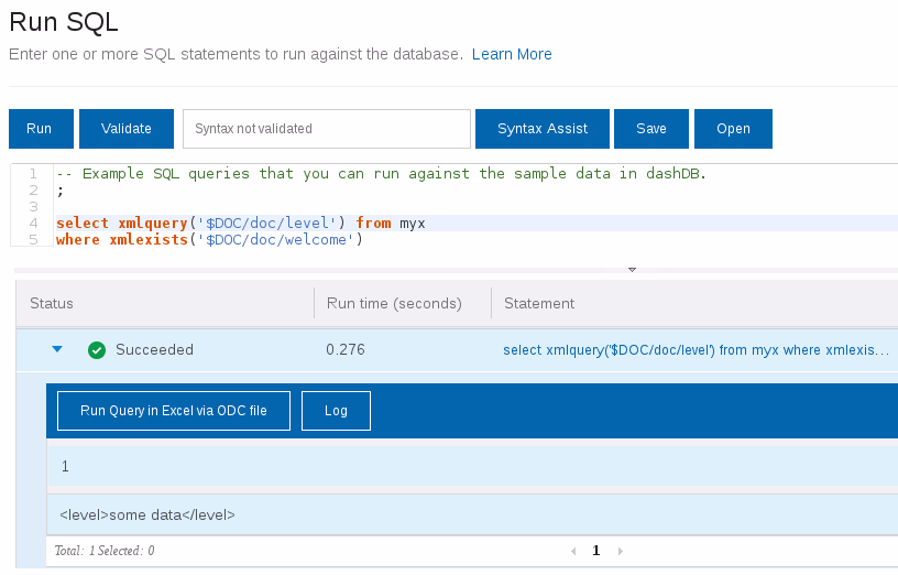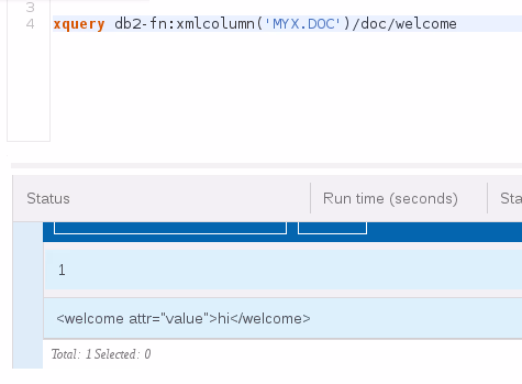 After the XML data is in, the “Run SQL” dialog can be used again to query the documents. Queries can be either in SQL (SQL/XML) or in XQuery, see the screenshots with examples.