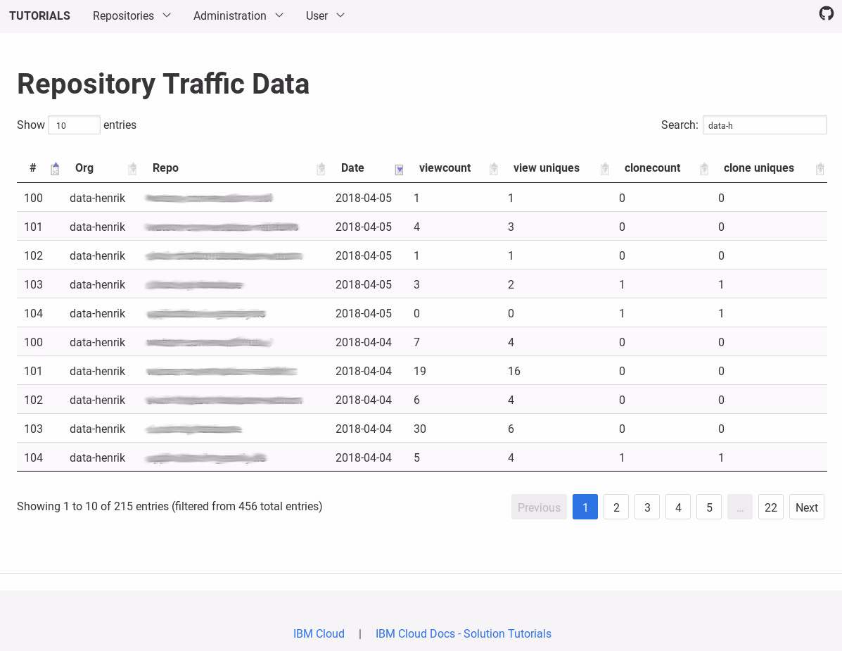 In a new solution tutorial, I show you how to automatically retrieve and store GitHub traffic data the serverless way with IBM Cloud Functions and Db2. The data can then be analyzed via a Web app deployed to Cloud Foundry on IBM Cloud. The app is secured with App ID using OpenID Connect. The new service Dynamic Dashboard Embedded provides visualization of the views and clones of GitHub repositories.
