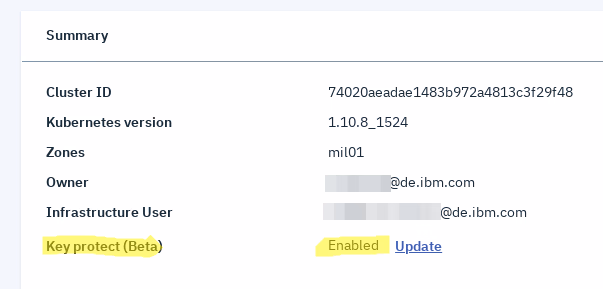 After you enabled a cluster to use Key Protect, the next obvious question is to prove it. How do you find out that it is indeed turned on? In the console, go to the cluster information again:
