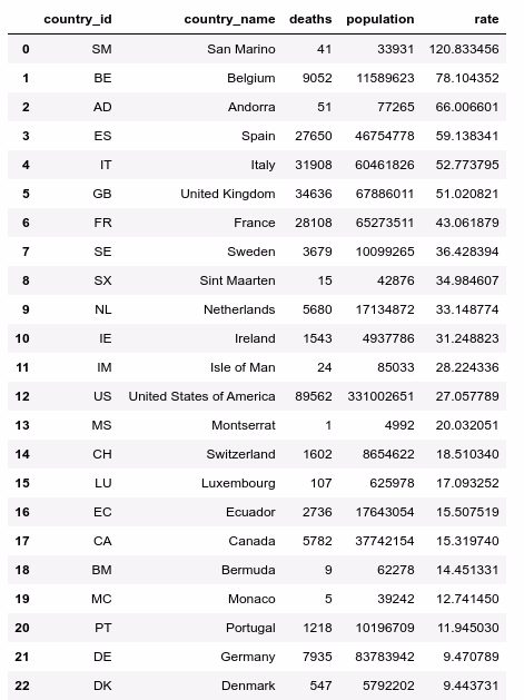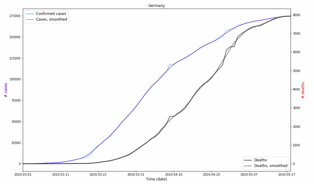 Most of us know how to write a simple SELECT … FROM … WHERE statement. But how do you easily put data from different days side by side? How do you compute rolling averages to smooth out reported values, e.g., to account for “administrative weekends”? See the above plot for raw vs. smoothed data for Germany. How do you make sure that all countries are represented, even if they did not report at the latest available date (MAX(date))? See the table below with mortality rates computed today based on the latest available data, not the current date. The answer is to apply SQL window functions and to utilize common table expressions. They allow to partition and order data, then apply additional functions on top. I have created a public gist on GitHub with sample SQL statements to dig into COVID-19 data. It is too long to embed it here. Feel free to comment there or add to it. The two screenshots in this post are based on data processed with such SQL statements.