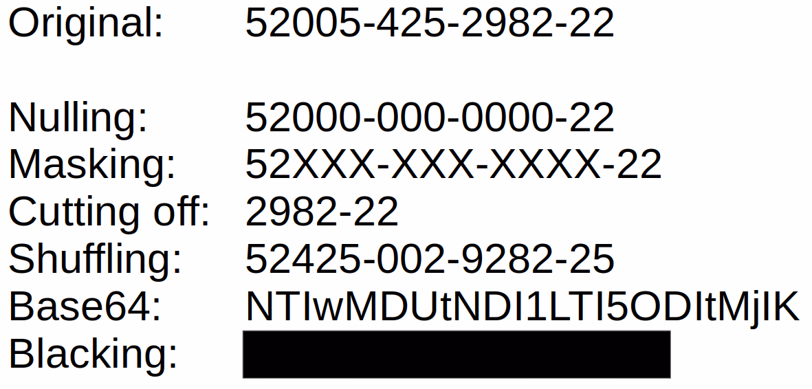 You may have noticed data masking in action. On payment receipts, parts of your card number is replaced by X or *. In letters or on the phone, reference are made to IDs starting or ending with some numbers without giving away all data. You may have seen declassified reports with parts blacked or deleted. All these are data masking techniques. Here are methods applied to the same input: