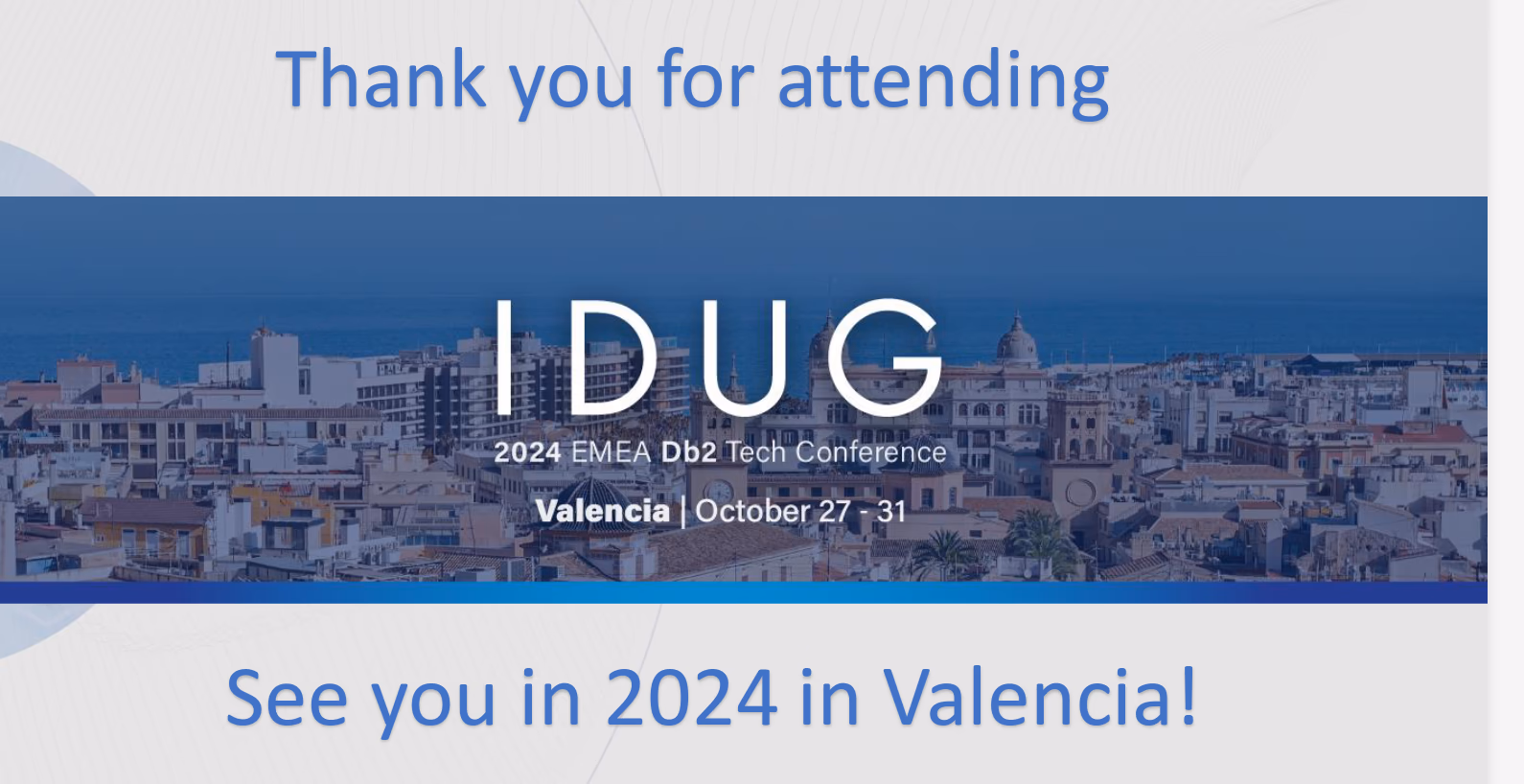 Without needing an account, you can find the list of all IDUG 2023 EMEA presentations in the online scheduler. If you attended, then you can download the presentation slides and soon the recordings. I am going to end my quick look back with this slide from the closing ceremony about IDUG 2024 EMEA Db2 Tech Conference: