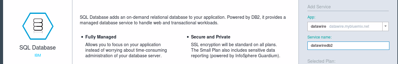 To use DB2 in Node-RED, you need to create a sqldb service in Bluemix first. This meant going back to the catalog, skipping to the Data Management section, selecting the sqldb service, and adding it to my application (see picture below). Thereafter, my application needed to be restaged (restarted), so that it could pick up the properties of the sqldb service.