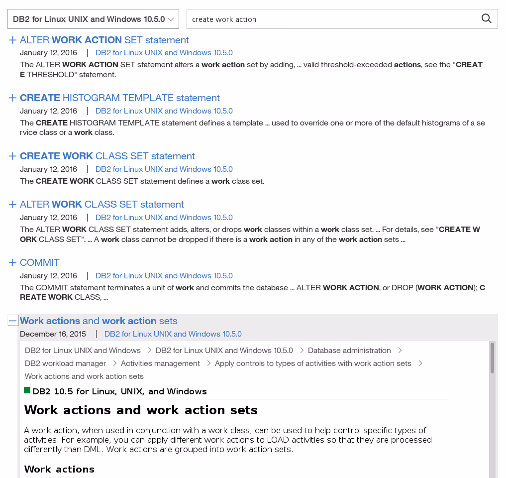 What I first missed due to layout changes was the navigation tree. It is visible after clicking the icon on the upper left and topics can be expanded much faster than in the old version of the Knowledge Center. What also is much faster is the search functionality. After clicking on “Search” on the upper right, a page with a search box is coming up. It is possible to select the DB2 version to be searched and enter the search term. Suggestions for possible keywords are made and when you hit “enter” the search results appear. Everything as expected. However, what I find very useful is the option to preview individual search results by expanding them within the result list (see screenshot below). That way you can stay with the result page without switching back and forth between documentation and search results.