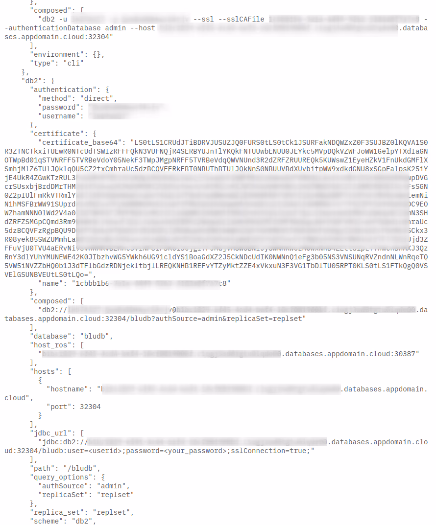 Over the past 12 months, Db2 on Cloud migrated instances to a new deployment model. It seems to be based on the IBM Cloud Databases model and resulted in a different structure for the service credentials. Previously, Db2 on Cloud instances were accessible on the typical ports 50000 and 50001. The JSON-based credentials object included ready-to-use connection URIs. Now, after the change, the VCAP object has more parts, but is missing the easy-to-use URIs. In the following, I am showing you how to consume the new credential structure in your app and to successfully connect to Db2 on Cloud.